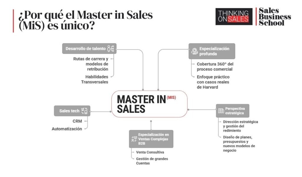 Mientras un MBA “tradicional” imparte de forma muy genérica temas como finanzas, operaciones, marketing o recursos humanos, el Master in Sales (MiS) profundiza definitivamente en la gestión end-to-end de todo el ciclo y etapas del negocio, con una estructura académica pensada para transformar la función comercial en una ventaja competitiva práctica.